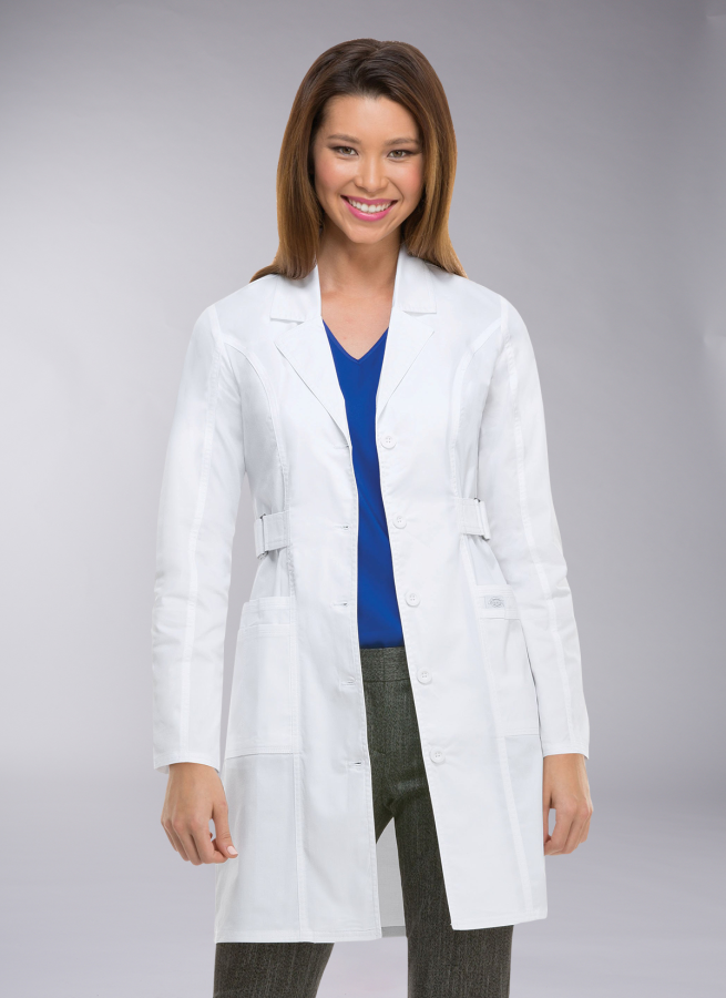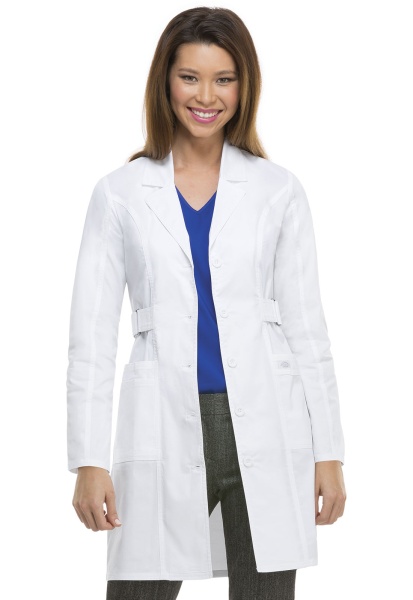 Халат на пуговицах с зубчатым воротом, двойной строчкой, передние и задние рельефные швы, кокетка на спине, карман для мобильного телефона, мульти-секционный карман, два вместительных накладных кармана, петли для бейджа и эластичные боковые ремни для регулировки талии.