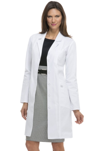 Халат на пуговицах с зубчатым отворотом и четырьмя накладными карманами (один нагрудный карман, два передних угловых кармана и один карман для мобильного телефона) со скрытым держателем для инструментов внутри правого кармана. Задние рельефные швы и пояс сзади дополняют образ.